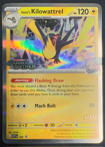 Kilowattrel #182 – Scarlet & Violet (Staff Promo). This Pokémon TCG card comes in raw, ungraded condition, with the Staff Promo foil finish that makes it a rare, behind-the-scenes collectible. Perfect for Kilowattrel fans or anyone chasing promo variants from the SV era. Our ungraded cards span many sets and rarities, making them ideal for completing collections, building decks, or adding standout display pieces without the graded premium.